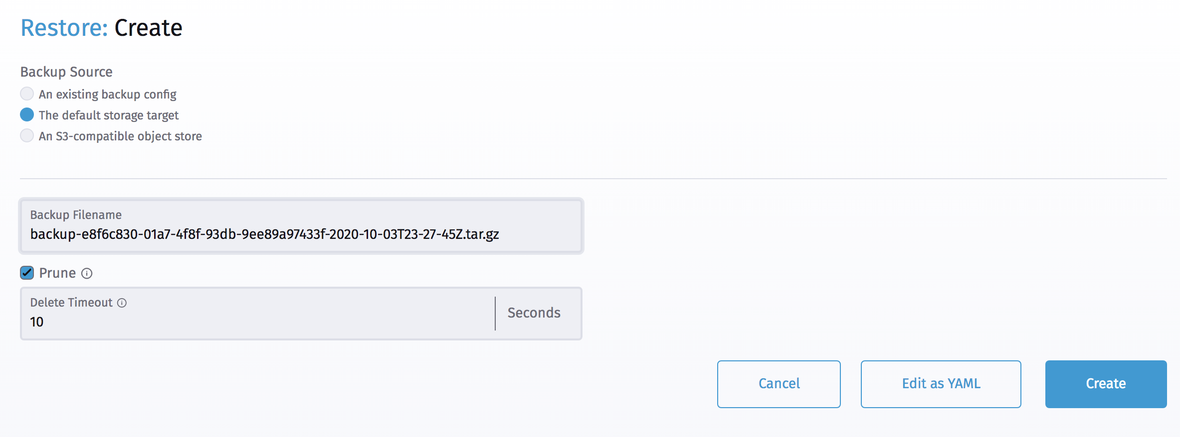 Selecting this option will populate the Target Backup dropdown with the Backups available in this cluster. Select the Backup from the dropdown, and that will fill out the Backup Filename field for you, and will also pass the backup source information from the selected Backup to the operator.