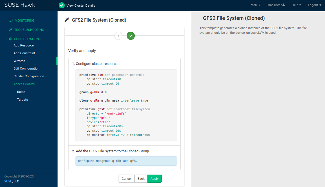 Procedure 26.6: Configuring GFS2 resources with Hawk2's Wizard