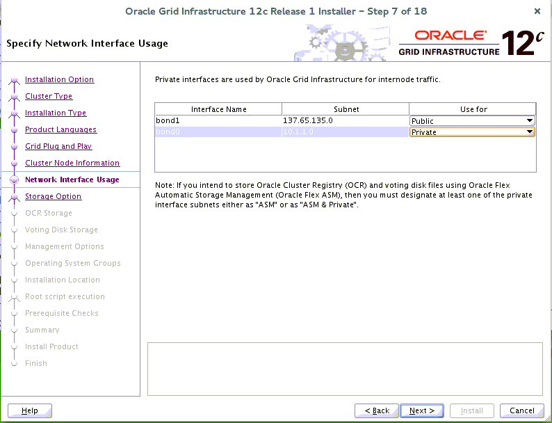 Figure 7: Network Interface Usage #Provide the details of the interfaces that are used by Oracle Grid for public and private traffic, then click Next to continue.