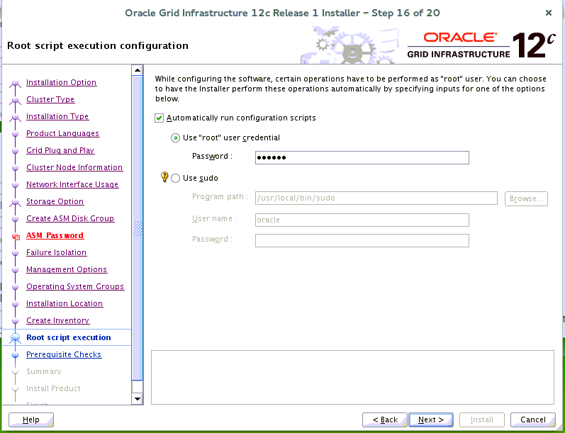 Figure 16: Root Script Execution Configuration #While configuring the software, you need to perform certain operations as root user. Choose the option as shown above. The Installer will then perform these operations automatically. Fill in the password for root user. Click Next to continue.