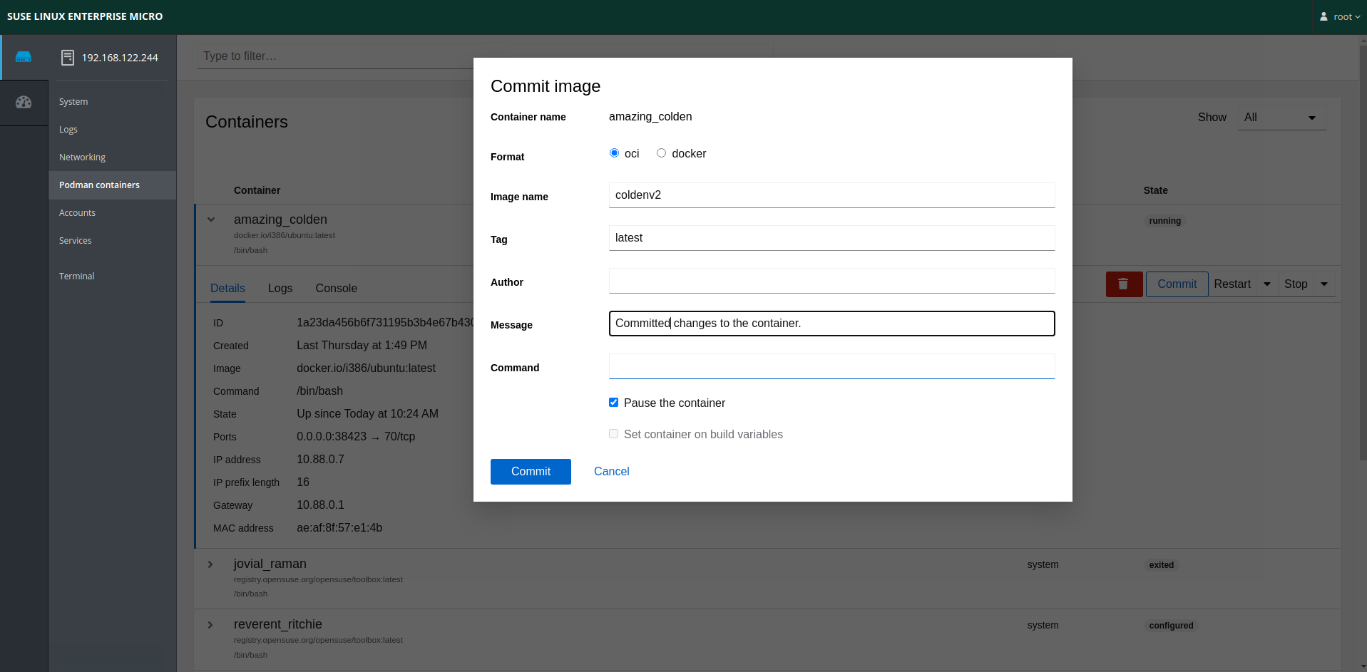 When using Cockpit, you can perform the commit operation directly from a container's Details, by clicking Commit. A dialog box opens. Specify all required details as shown below and click Commit: