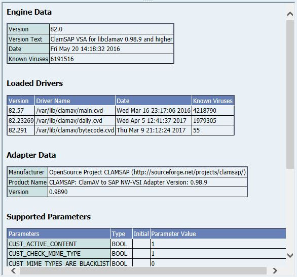 Afterward, a summary will be displayed, including details of the ClamSAP and ClamAV (shown in Figure 11.2, “Summary of ClamSAP data”).