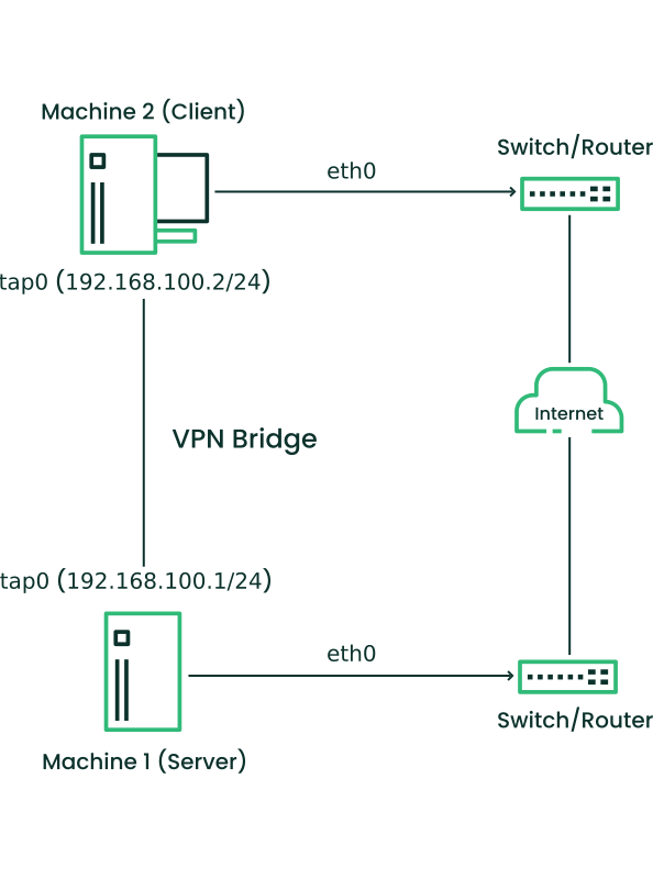 On both sides, the Server (Machine 1) and Client (Machine 2), the TAP device tap0 is bridged to a local network interface eth1. Layer 2 traffic from the client network LAN 2 will be forwarded to the server network LAN 1 and vice versa.
