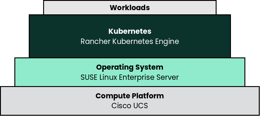The base, starting configuration can reside all within a single Cisco UCS server. Based upon the relatively small resource requirements for a Rancher Kubernetes Engine deployment, a viable approach is to deploy as a virtual machine (VM) on the target nodes, on top of an existing hypervisor, like KVM.