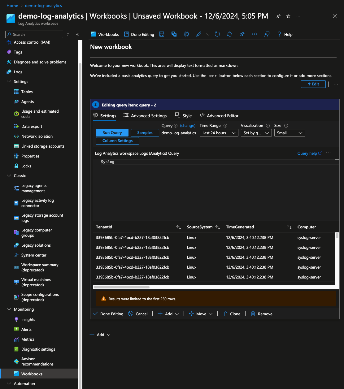 To confirm that Azure Log Analytics Workspace is ingesting the data from the syslog-server navigate to Workbooks in the Log Analytics Workspace page of the Azure Portal. Select Default Template, then change the text in the query to Syslog and click Run Query. The results should populate with data and allow for scrolling to verify that log data is coming in from the syslog-server VM as expected.