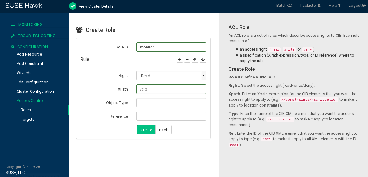 The previous command creates a new role with the name monitor, sets the read rights and applies it to all elements in the CIB by using the XPath expression /cib. If necessary, you can add more access rights and XPath arguments.