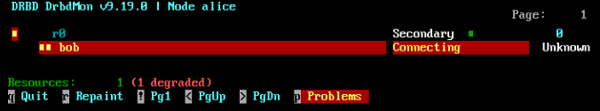 #umount /srv/r0Downgrade the DRBD service on bob by typing the following command on bob: