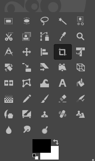 The current foreground and background color are shown in two overlapping boxes. The default colors are black for the foreground and white for the background. Swap the foreground and background color with the bent arrow icon to the upper right of the boxes. Use the black and white icon to the lower left to reset the colors to the default. Click the box to open a color selection dialog.