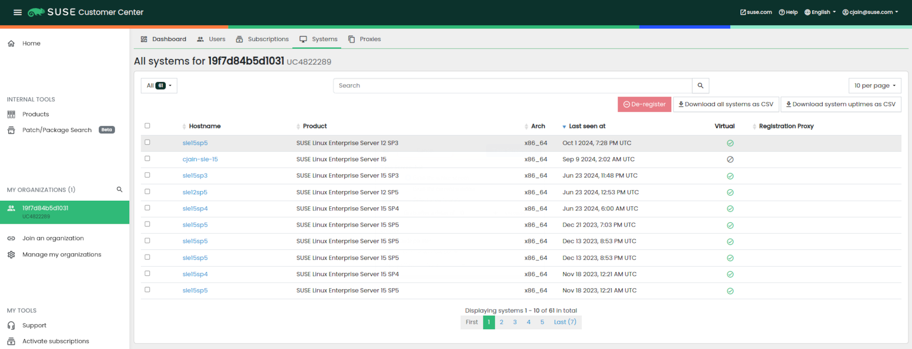 In the list of systems, identify the client for which you want to retrieve the uptime data by matching its credentials found in the client's /etc/zypp/credentials.d/SCCcredentials file.