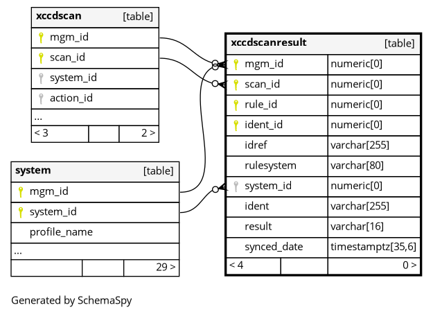 | xccdscanresult_pk | Primary key | Asc/Asc/Asc/Asc | mgm_id + scan_id + rule_id + ident_id |