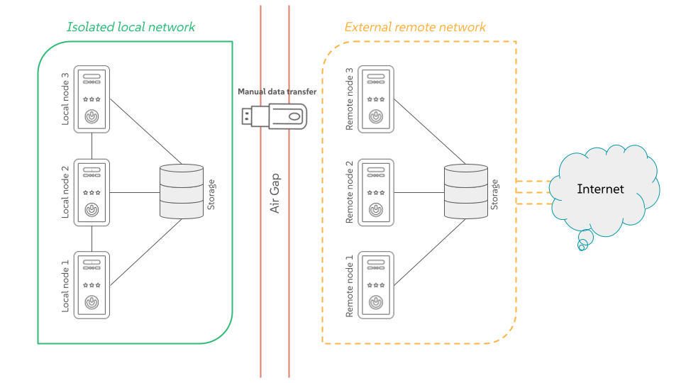 An air-gapped environment is a security measure where a single host or the whole network is isolated from all other networks, such as the public Internet. This “air gap” acts as a physical or logical barrier, preventing any direct connection that could be exploited by cyber threats.