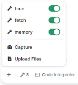 MCP servers offer additional services that enhance the AI model responses and make them more specific. This section details how to enable individual mcpo services from the input field.