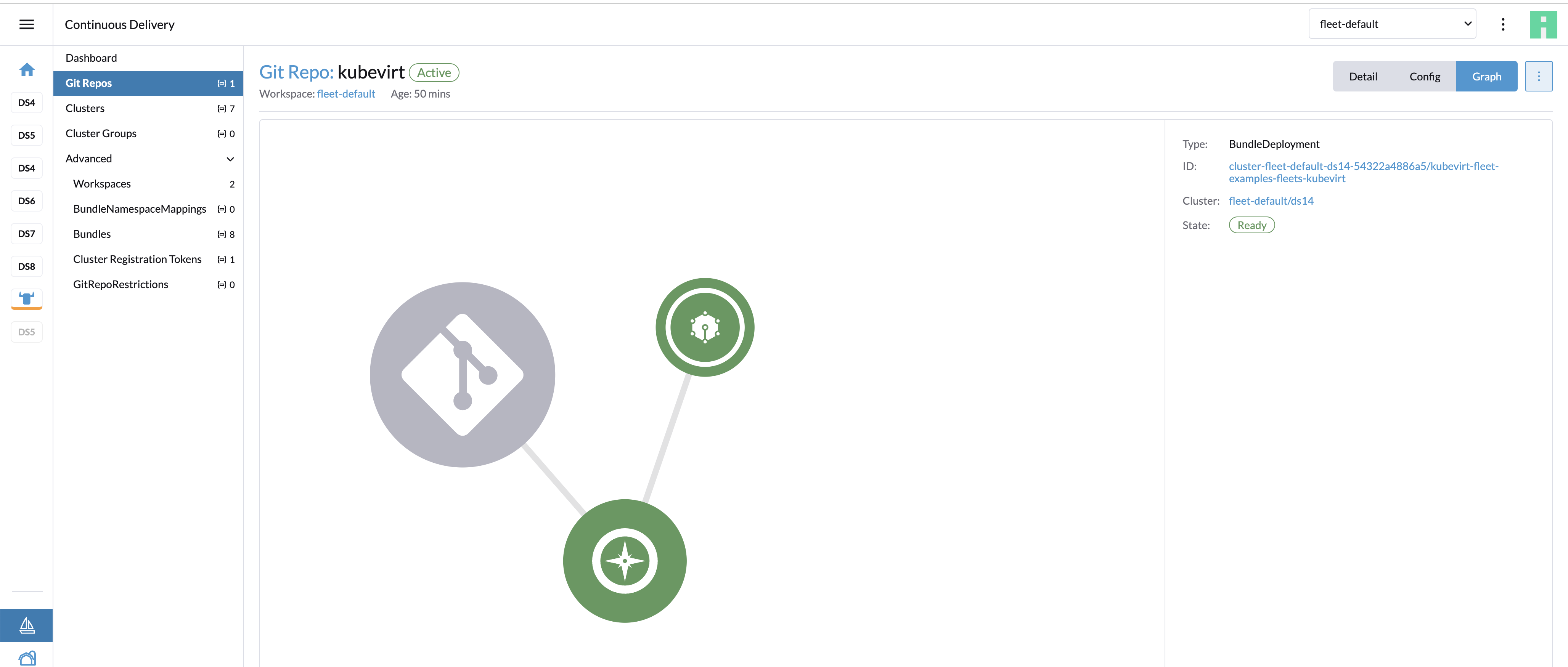 For each cluster, the bundle is applied to a BundleDeployment resource that is created. To view BundleDeployment details, click the Graph button in the upper right of the Git repo detail page.