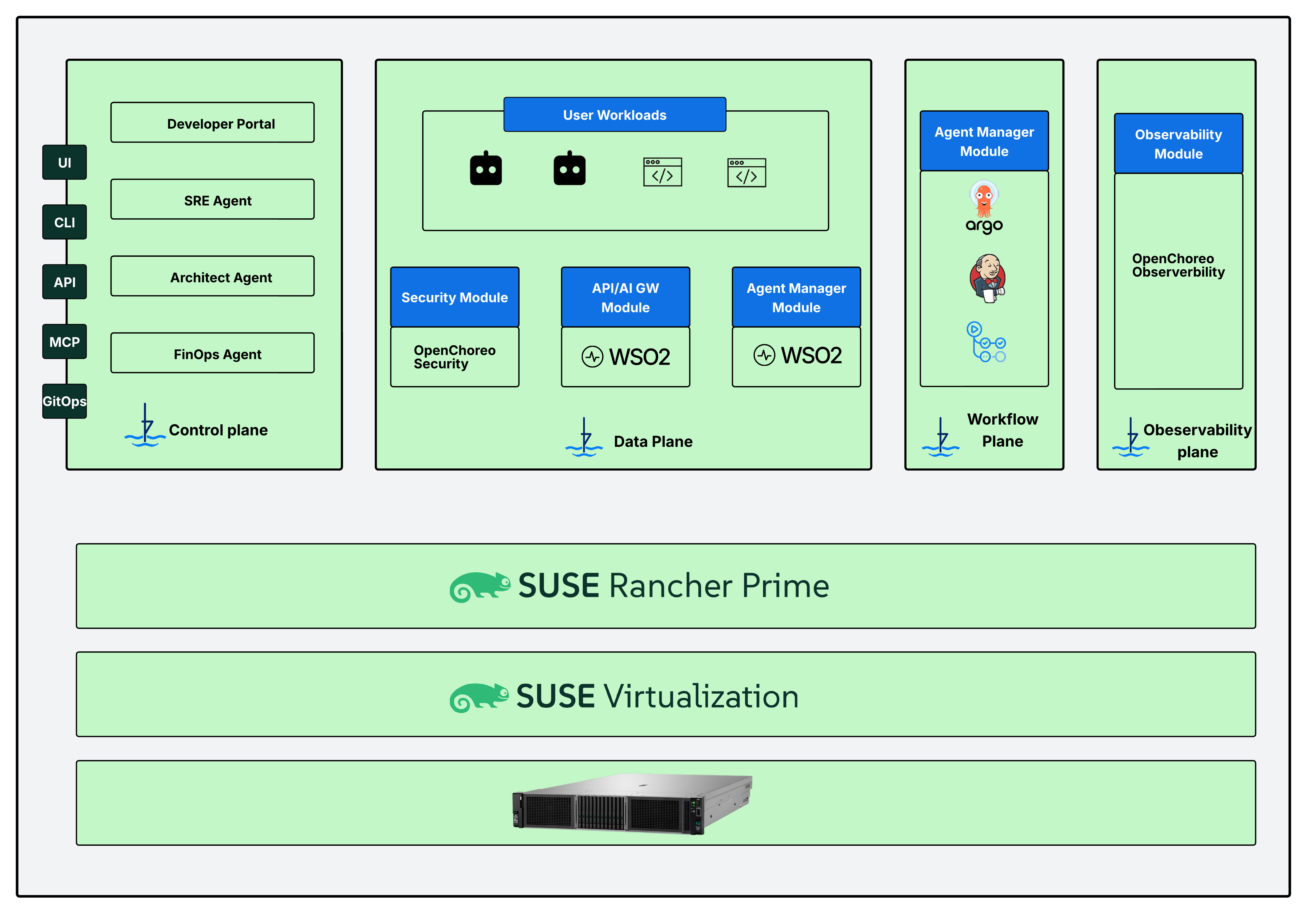 This guide presents a reference architecture that combines SUSE® Rancher Prime and the WSO2 Developer Platform for OpenChoreo to build an enterprise internal developer platform. SUSE Rancher manages Kubernetes clusters while OpenChoreo provides developer self-service, CI/CD, observability, governance, AI-native operational agents, a WSO2 AI/API Gateway, and a WSO2 Agent Manager for agent lifecycle management.