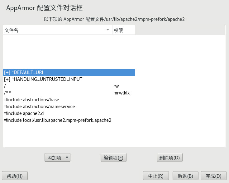 当 Apache 可感知 ChangeHat 后,便会检查以下自定义的 AppArmor 安全配置文件,检查的顺序为向其收到的各 URI 请求指定的顺序。