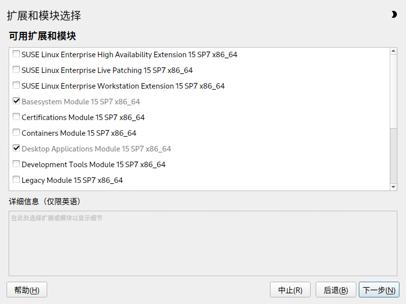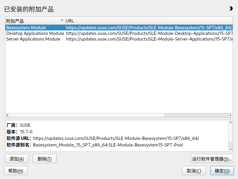即使在安装和注册系统之后,您也可以添加和去除模块与扩展。可以使用 YaST 或 SUSEConnect 执行此类操作。有关更多信息,请参见模块和扩展快速入门。