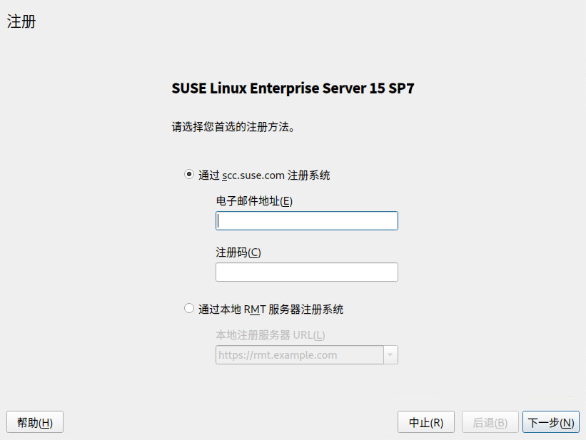 要获取技术支持和产品更新,需要在 SUSE Customer Center 中注册并激活 SUSE Linux Enterprise Server。建议您在安装期间注册,因为这样可以随系统一起安装最新的可用更新和补丁。不过,如果您处于脱机状态或者想跳过注册步骤,以后随时可以从安装的系统注册。