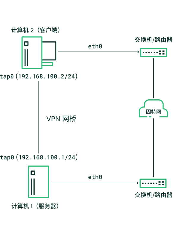 TAP 设备只能用于 VPN 端点本身。第 2 层 VPN 流量由服务器(机器 1)或客户端(机器 2)直接发起。