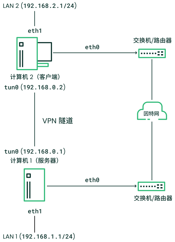 tap0都被桥接到本地网络接口eth1。来自客户端网络 LAN 2 的第 2 层流量将被转发到服务器网络 LAN 1,反之亦然。