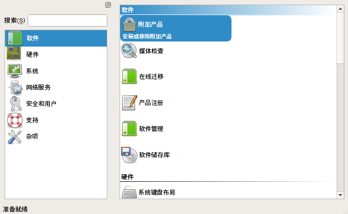 YaST 启动时会显示可用模块的概览(图 3 “YaST 控制中心”)。单击图标即可打开相应模块。