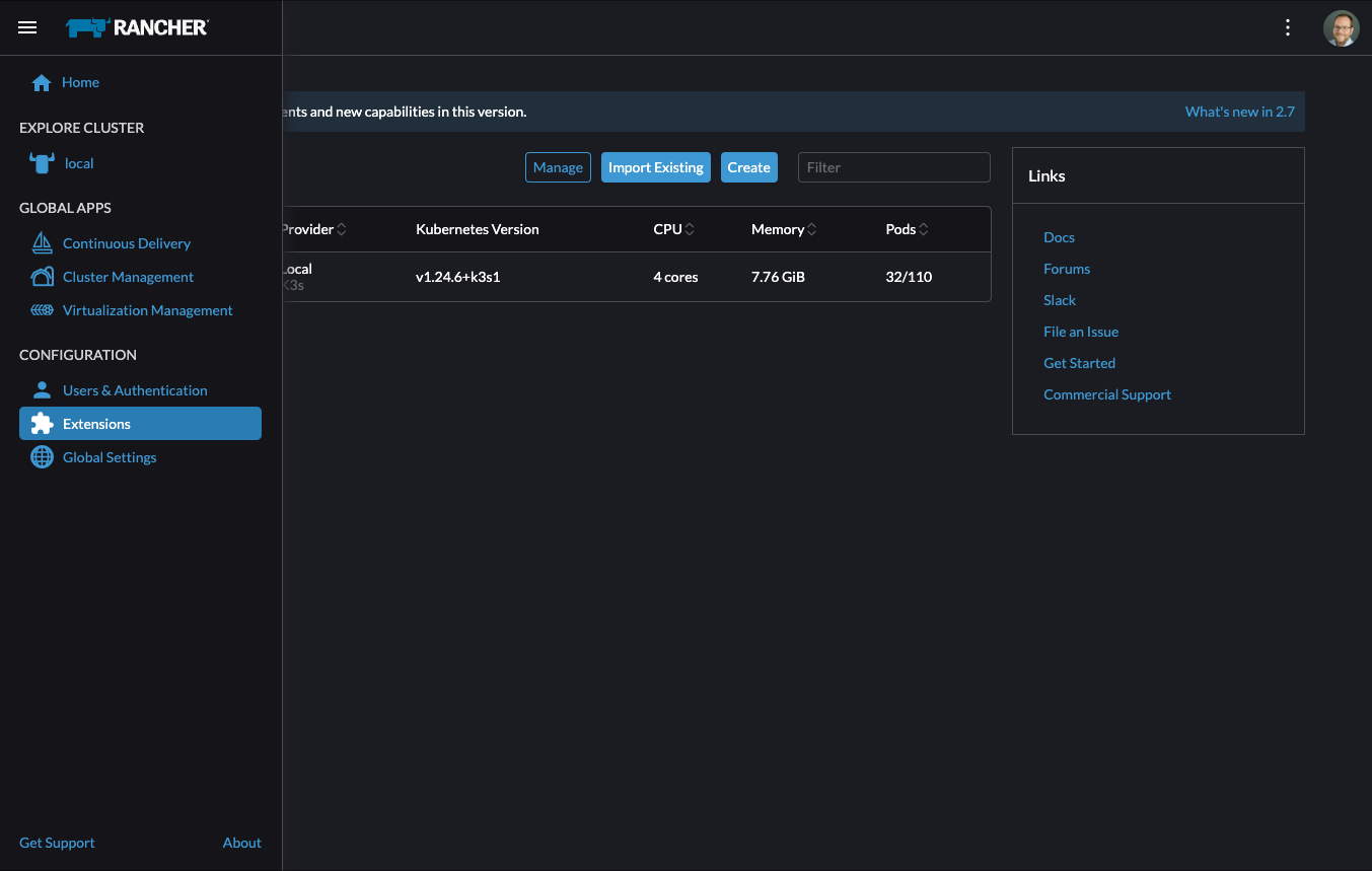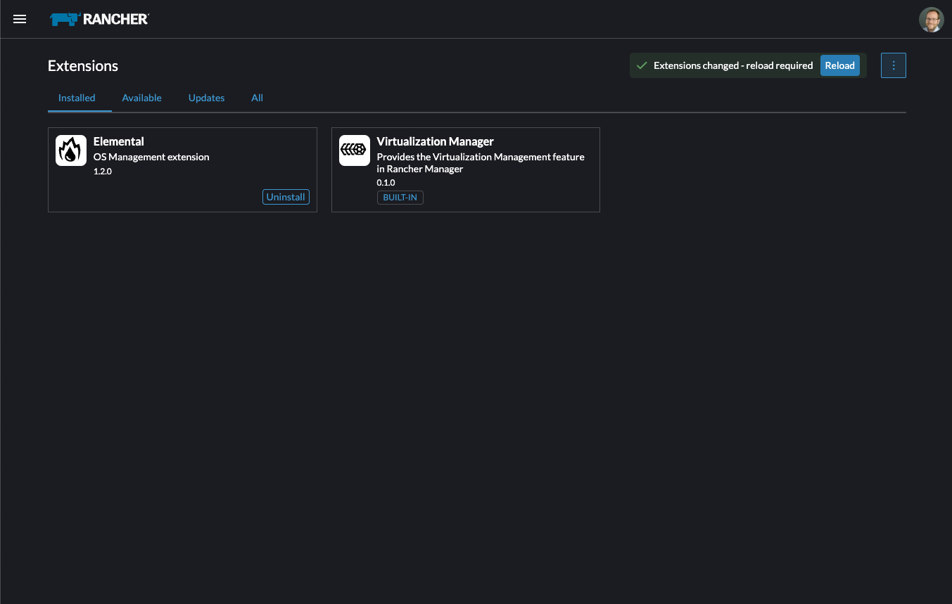 安装 Rancher 后,接下来可以安装 Elemental Operator 和所需的 CRD。Elemental 的 Helm chart 作为 OCI 制品发布,因此其安装过程比其他 chart 略简单一些。可以通过您用来安装 Rancher 的同一外壳安装 Helm chart,也可以在浏览器中通过 Rancher 的外壳安装。